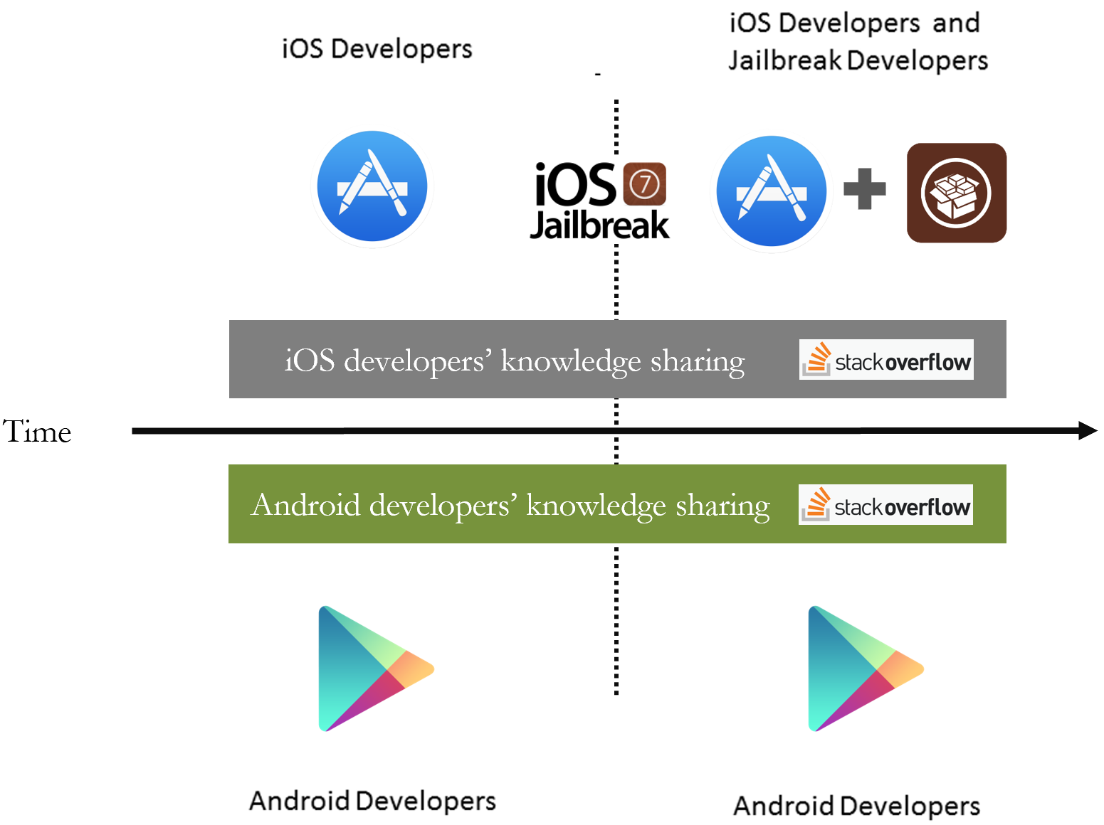 As illustrated in the figure below, we leverage the unexpected timing of the jailbreak of iOS 7 in 2013 as a natural experiment, to compare the Q&A activities of iOS app developers (treated group) and otherwise comparable Android app developers unaffected by the jailbreak (control group), on StackOverflow.com, an active online forum of software developers. The jailbreak significantly weakens (for a short period) Apple’s strict access control, such that imitating app developers (and apps) can now gain access to the App Store and users of iOS devices. We find that the jailbreak reduces the amount and quality of the knowledge shared by iOS app developers—their posting of Q&As decreases by 7%, and the quality of their posts by 15%. Such effects can be seen as causal given the research design.