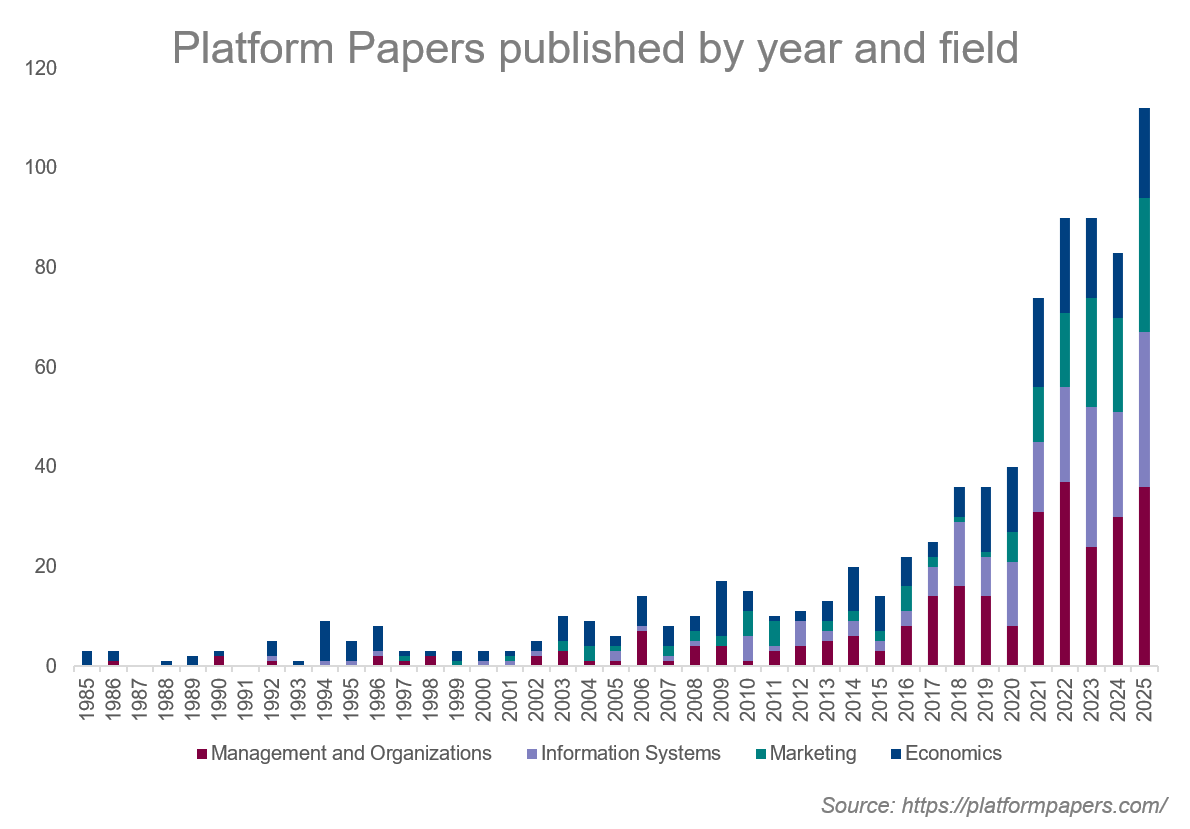 Platform Papers started when Melissa Schilling and I set out to conduct a systematic and interdisciplinary review of the academic literature on platform competition (published in the Journal of Management, open access). We conducted a Boolean search query on Web of Science to collect the initial sample of articles considered for the review. The search query focussed on articles’ titles and their publication outlets.